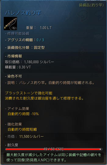 魚を釣り上げるたびに、釣竿は摩耗していく。バレノス釣り竿は修理が可能なため、魚の売却が済んだら鍛冶屋や厩舎番で修理をしておこう。