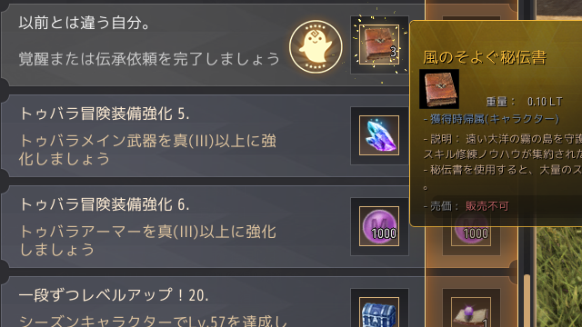 覚醒/伝承の依頼を完了したことで、シーズンパス報酬が受け取り可能となる。「風のそよぐ秘伝書」を使用すると、大量のスキル経験値を獲得できるので、直ぐに使っておこう。