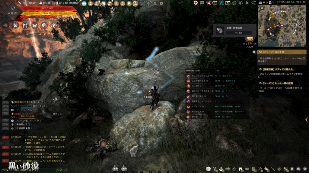 メイン依頼「行方不明」では、放浪盗賊駐屯地を突っ切る必要があり、自動ルートだと敵に阻まれ囲まれてタコ殴りに遭う危険がある。ここは手動でルートを辿り、途中で崖を登る際に別の場所にリルートされてしまう場合があるので、その際は依頼欄から再度ルートを出して向かおう。