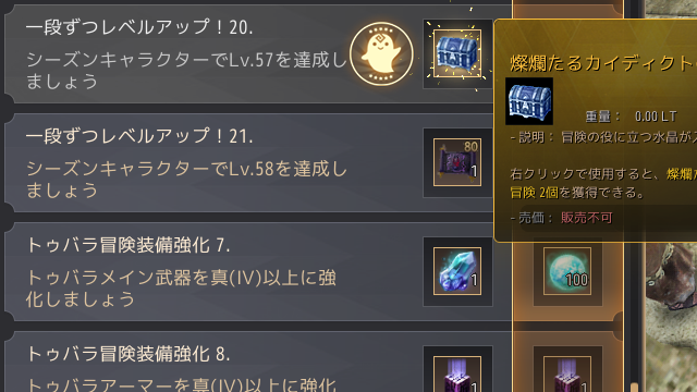 メイン依頼「古代の隙間」を受領すると、闇の精霊のメイン依頼に「より広い世界への冒険のため」が追加される。これは、装備による一定の攻撃力/防御力を満たしていると受注と同時に即クリアとなる依頼で、トゥバラ装備を順調に強化できていればすぐに達成できる。もし完了しない場合でも、焦らず強化を進めれば、そのうち達成できる。