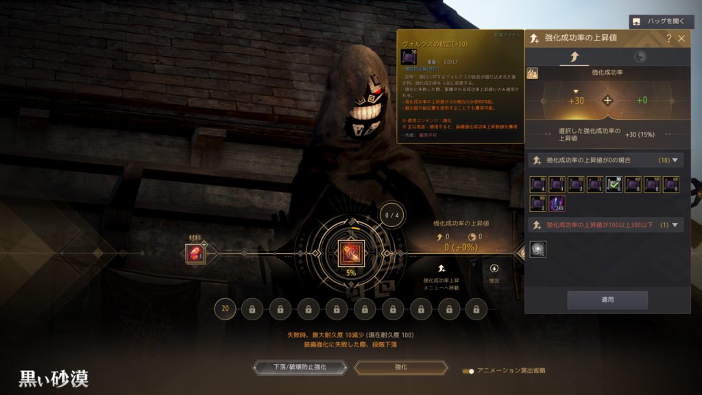 【1】ⅣからⅤへの強化では、失敗するとⅢに下がってしまうため、なるべく成功率を上げたい。中央右寄りの「強化成功率上昇メニューへ移動」をクリックし「ヴォルクスの助言(+30)」を左クリック→適用する。すると成功率が上昇するので、この状態で強化を実行する。