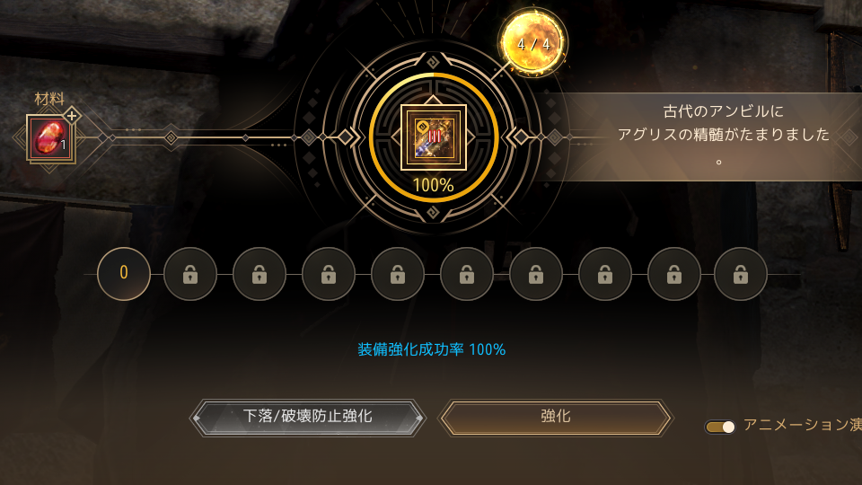 これまで通り、強化画面で装備を右クリックし、強化スロットに入れる。Ⅳへの強化は素の成功率は低いが、失敗してもⅢ以下には下がらないので、そのまま実行しよう。失敗する毎に「強化成功率の上昇値」が上がり、且つ「アグリスの精髄」が貯まっていく。