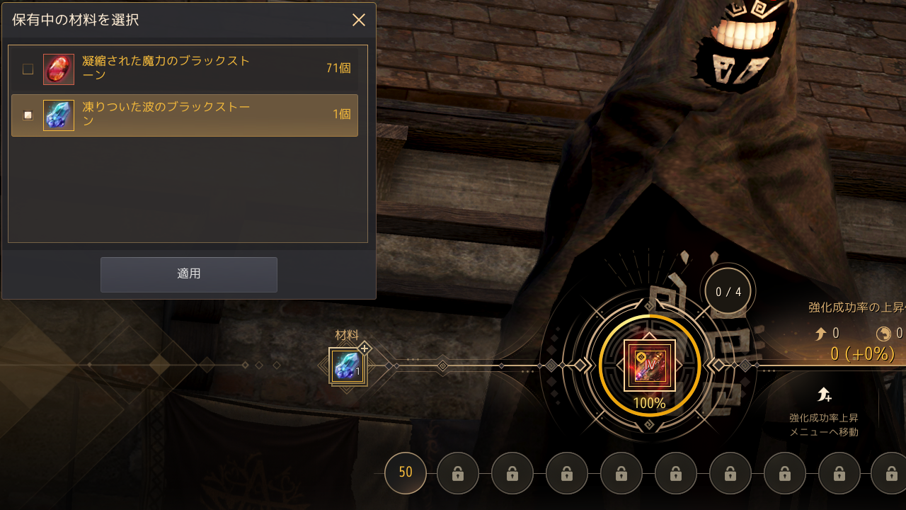 凍りついた波のブラックストーンは1つしか入手できないため、残りの武器防具はこれまで通り「凝縮された魔力のブラックストーン」を使用して強化していく。ポイントは、Ⅳへの強化や確定強化では値を温存し、Ⅴへの強化にはなるべく高い値で挑むということ。