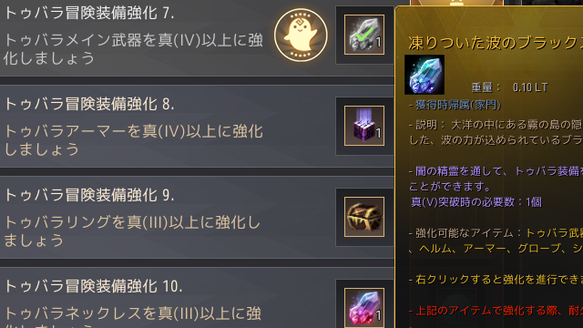 特にメイン武器Ⅳの課題報酬「凍りついた波のブラックストーン」は、これまでの素材「凝縮された魔力のブラックストーン」の代わりに使用することで、トゥバラ武器防具を真Ⅳ→Ⅴに確定強化できる。一番優先度の高いメイン武器に使って、Vに確定強化させよう。強化画面でメイン武器を強化スロットに投入すると、素材を選択できるので、凍りついた波のブラックストーンを選ぶ。