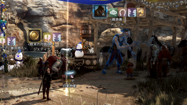 続く「秘密結社の証」では、自動ルートでは完了対象に辿り着かないが、すぐ奥の厩舎番メイシャと「会話」すれば進行する。完了対象はほんのり青く光り、頭上に青いアイコンが表示されるようになっている。