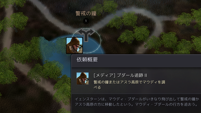 その後の「ブダール追跡Ⅱ」の行先は「警戒の鐘」がアタリだ。自動ルートはランダムなので、マップを開き、警戒の鐘に出ているアイコンを右クリックして向かおう。