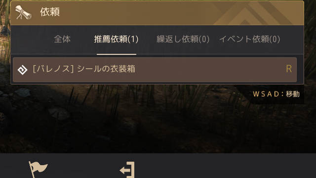 すると下部メニューに「依頼」が追加され光っているのでクリック。[バレノス]名誉ある衣装箱を受注しよう。