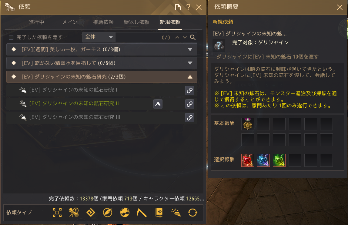 【黒い砂漠】攻略情報狩りを通じて「未知の鉱石」を入手し、高額なアイテムと交換してもらえるイベント。対象の狩場には「無限POT素材」や「太古防具の火種」の狩場も含まれているため、それらの週課ついでに狙っていこう。それぞれ未知の鉱石10個と高額アイテムを交換できる依頼が3つ、新規依頼に追加されている。詳細は公式サイトを参照されたい。