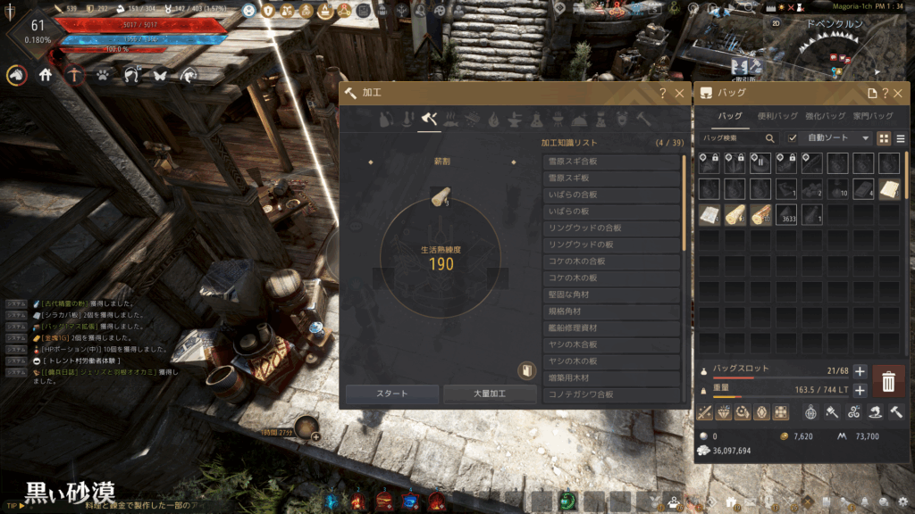 入手後はそれぞれ、Lキーで開く加工ウィンドウで薪割を選択し、原木を投入して加工すれば板が完成する。なお、近年のアップデートで、薪割を行うのに特段知識の習得等は不要になった。