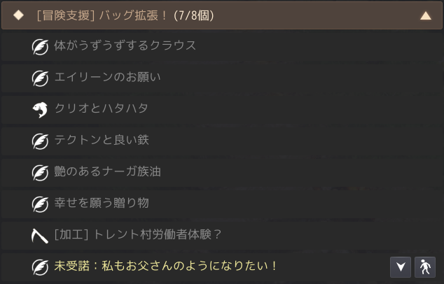 そのままジェリズから「一緒に仕事をした仲間」を受け、村長のドルゲフで完了させる。するとようやく、お目当ての「私もお父さんのようになりたい!」がドルゲフから受けられる。